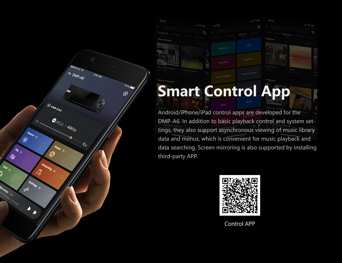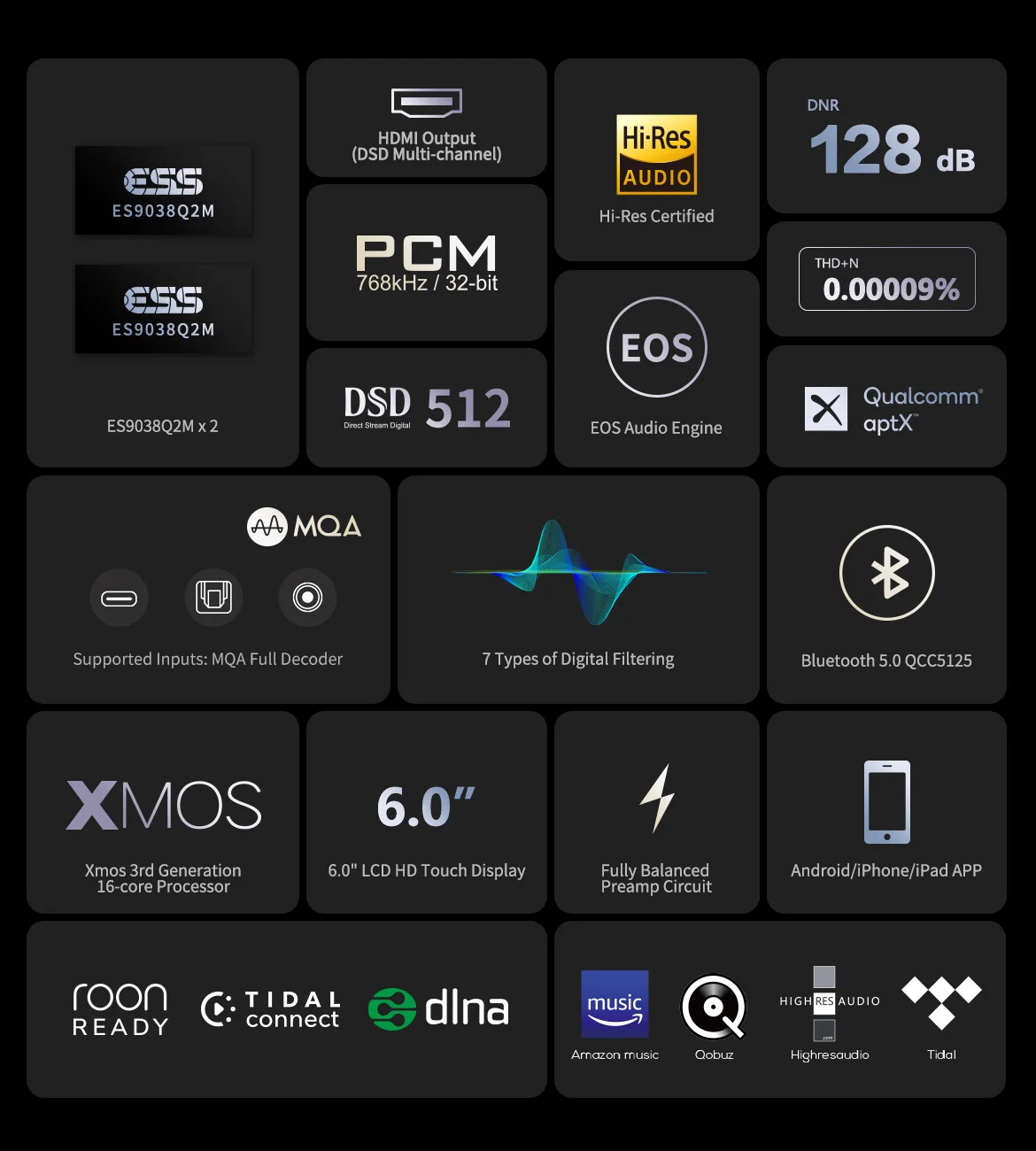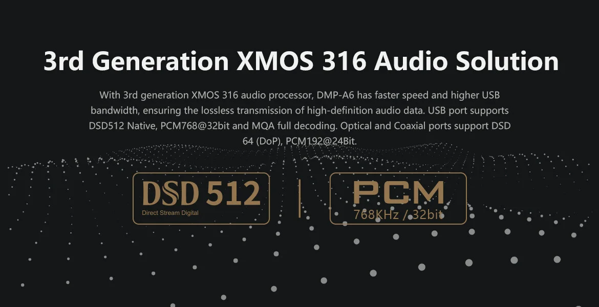 • Ondersteuning voor DSD512 Native, PCM768KHz@32Bit, volledige MQA-decodering.