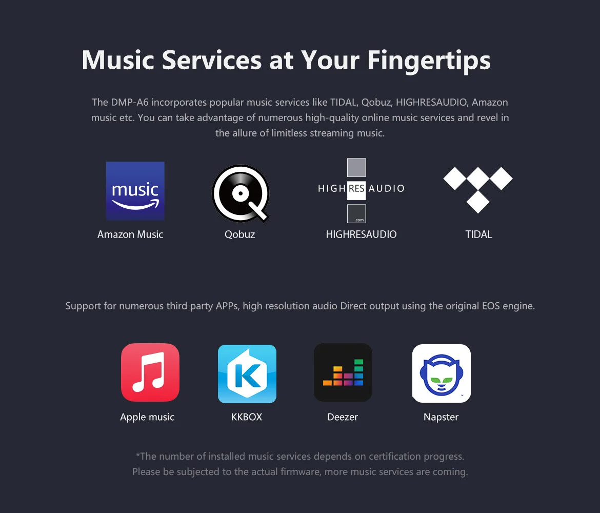Spotify Connect, Tidal Connect, Airplay 2, Roon, Eigen app