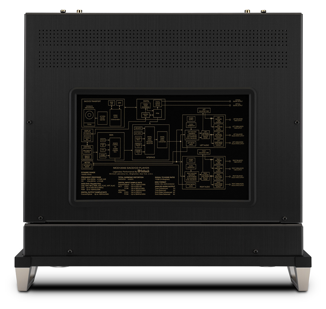 Naast commerciële SACD’s en CD’s, kan de MCD12000 ook muziek afspelen van zelfgemaakte cd’s of dvd-gegevensschijven. Talloze bestandsformaten kunnen vanaf deze schijven worden afgespeeld, waaronder AAC, AIFF, ALAC, DSD (tot DSD128), FLAC, MP3, WAV en WMA. Een optische dubbele laser zorgt voor een optimale aflezing van alle gangbare schijftypes. Het loopwerk beschikt over een precisie gegoten aluminium lade die zorgt voor een soepele en stille schijfbehandeling, terwijl een geavanceerde digitale servo zorgt voor een snelle, stille en nauwkeurige werking. De audiogegevens van de schijf worden op dubbele snelheid gelezen, wat zorgt voor een betere disc-tracking en foutcorrectieverwerking. Power Control en datapoorten zorgen voor naadloze integratie met andere McIntosh-producten.