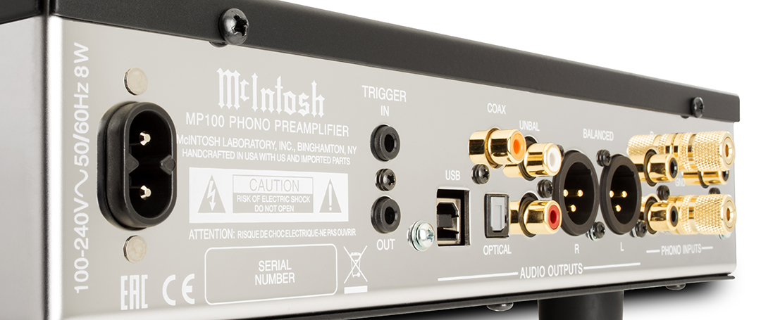 Zoals alle McIntosh-producten zit de MP100 boordevol functies die speciaal zijn ontworpen voor de vinylliefhebber, waaronder Moving Coil- en Moving Magnet-ingangen. Moving Coil en Moving Magnet instelbare belasting (elk 6 instellingen), gebalanceerde en ongebalanceerde analoge uitgangen, optische, coaxiale en USB digitale uitgangen en een Mono-schakelaar voor het afspelen van monoplaten om ruis te verminderen en het signaal correct af te spelen. Voor puur analoog gebruik kunnen de digitale uitgangen volledig worden uitgeschakeld.