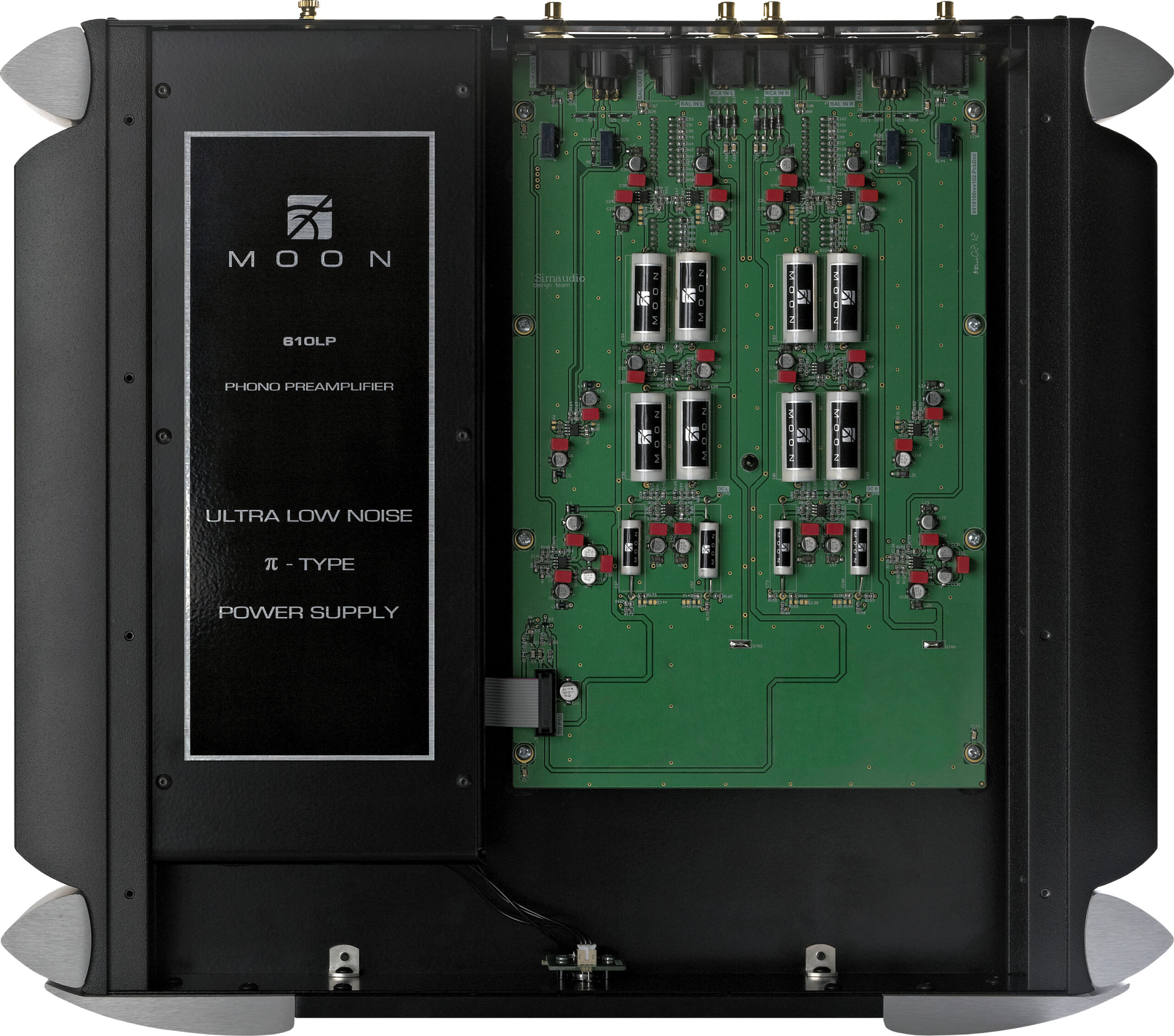 De MOON 610LP is een zeer configureerbare phono-voorversterker en biedt instelbare versterking, impedantiebelasting, capaciteitsbelasting en equalizercurves, die allemaal kunnen worden ingesteld met DIP-schakelaars op het onder paneel. Deze schakelaars bevinden zich direct in lijn met het circuit op optimale locaties om de kortst mogelijke signaalweg te verkrijgen. Deze aanpassingen, in combinatie met een uitstekende overbelasting marge, zorgen ervoor dat de MOON 610LP kan werken met vrijwel elk beschikbaar phonopatroon.