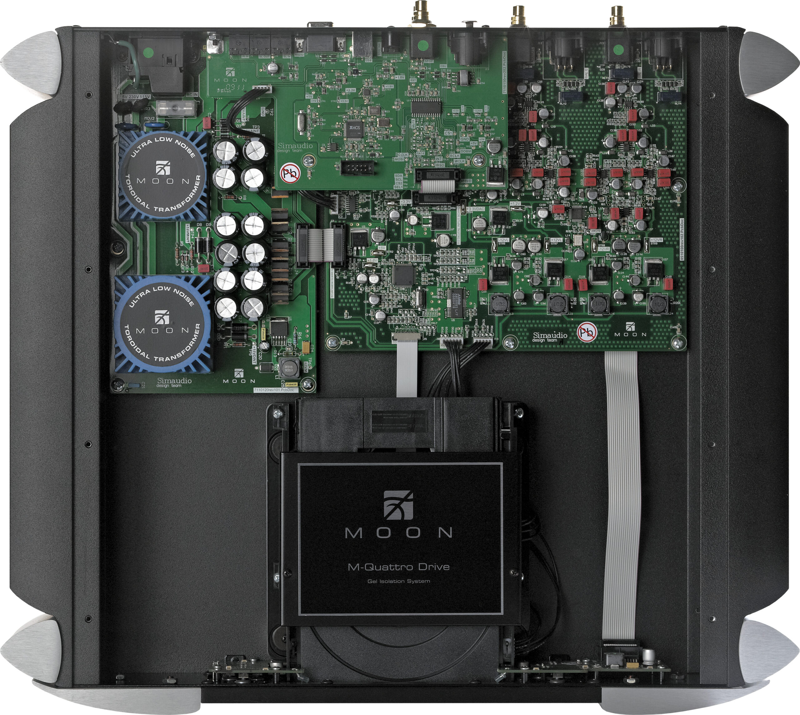 • Eigen CD-drive systeem gemonteerd op onze M-Quattro gelgebaseerde 4-punts zwevende ophanging.