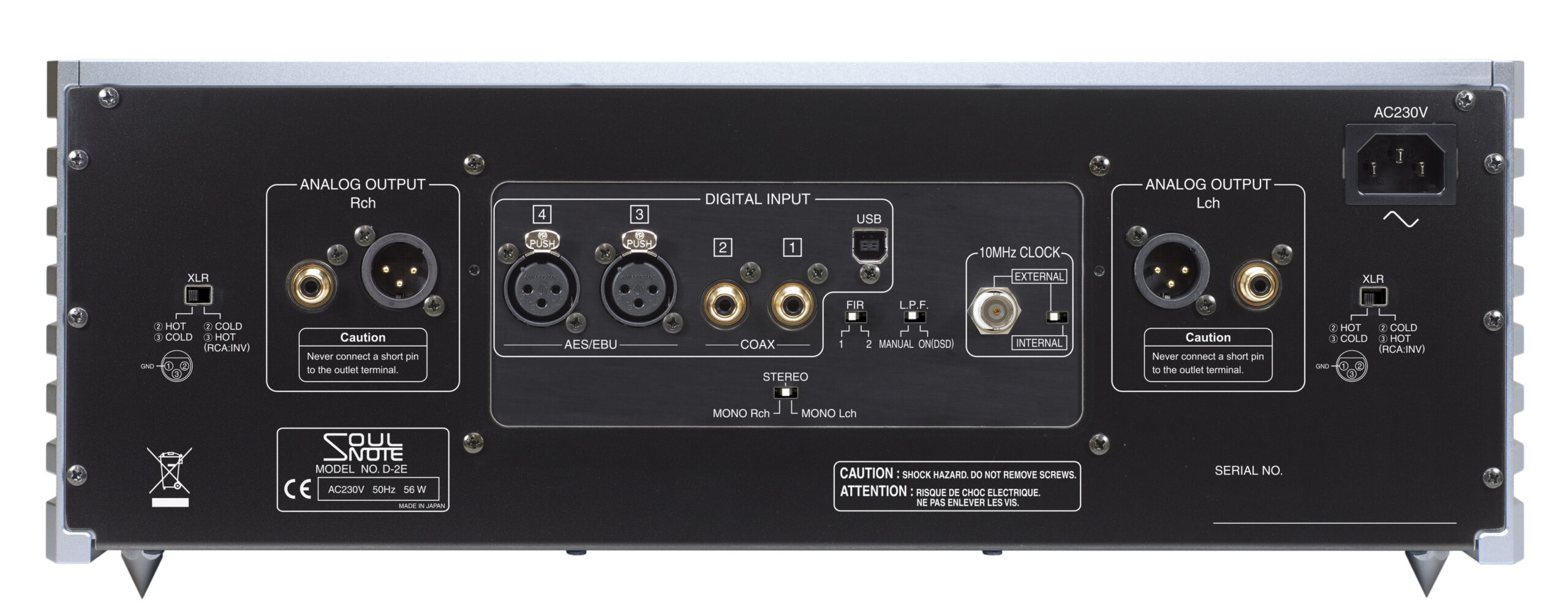 Gebruikmakend van een DDS met jitter-capaciteit die een kristal overtreft, beschikt de D-2 over standaard 10MHz externe klokingangen – een primeur van SOULNOTE. De interne klok is gebaseerd op een hoogwaardige TCXO met verbazingwekkende faseruis (-121dB bij 10Hz offset). Het beschikt ook over een hoogfrequent relais met mechanische contacten om extra IC-jitter te elimineren bij het schakelen tussen de interne klok en een externe klokgenerator. Bij gebruik van een externe klok wordt de interne klokvoeding uitgeschakeld en worden de trillingen gestopt, er is dus geen risico op onderlinge interferentie.